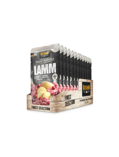 Agneau : viande, foie, panse, poumon, cœur (63 %); Bouillon de viande d´agneau (28 %); Pomme de terre (4 %); Canneberges (4 %); Huile de carthame (0,5 %); Substances minérales (0,5 %).