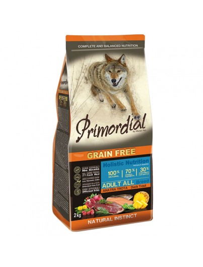 Truite fraîche (35%), viande déshydratée de Canard (25%), petits pois, pommes de terre, graisse de poulet (10%), féverole, graines de lin (2,5%), pulpe de betterave séchée, levure de bière, farine d'algues marines (0,3%), Fructo-oligosaccharides FOS (0,2%), produits des levures (MOS 0,2%), Yucca des Mohave (0,03%), racine de Pissenlit en poudre (Taraxacum officinale W.) (0,02%), Grenade déshydratée (Punica granatum) (0,02%), pied d'ananas déshydraté (Ananas sativus L.) (0,02%), Rosier des chiens Fruit déshydraté (Rosa Canina L., R. Pendulina L.) (0,002%), Glucosamine, sulfate de Chondroïtine, extrait de Romarin.